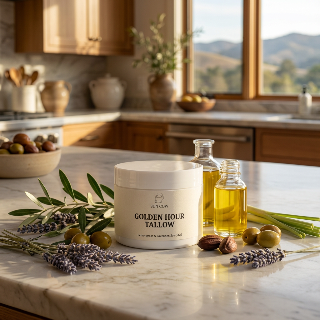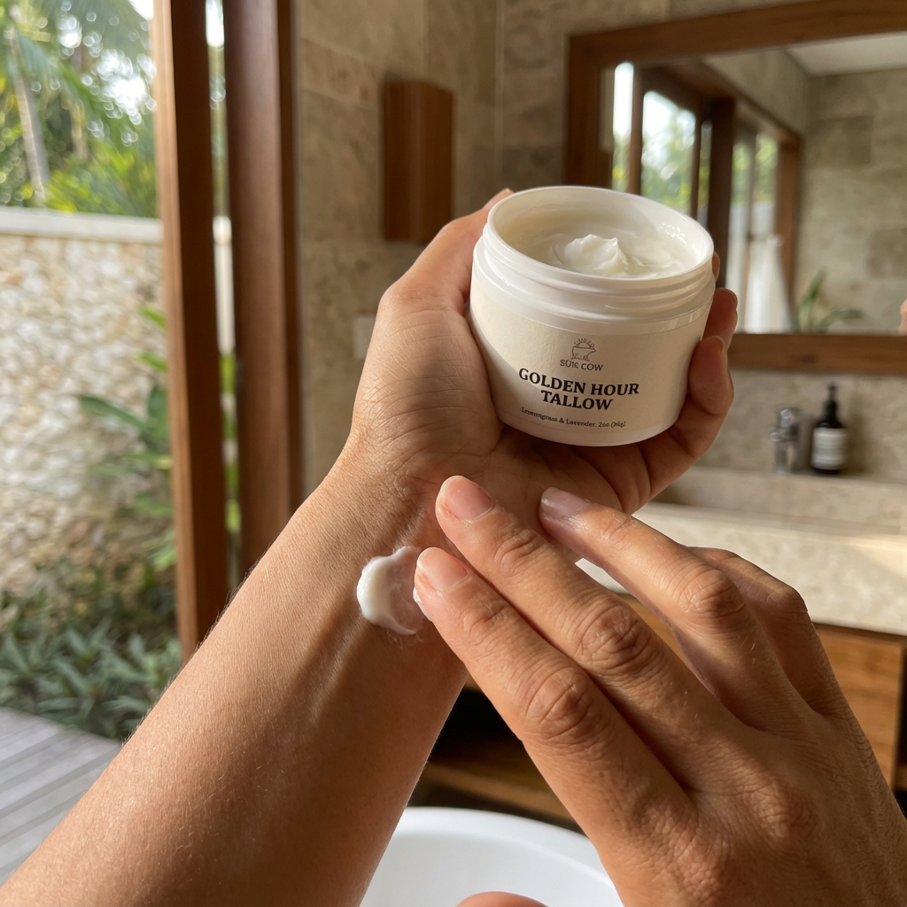 Golden Hour Tallow is a whipped, ingredient-first moisturizer made with grass-fed tallow and essential oils. It absorbs quickly, leaves skin soft—not greasy—and is gentle enough for daily face and body use.